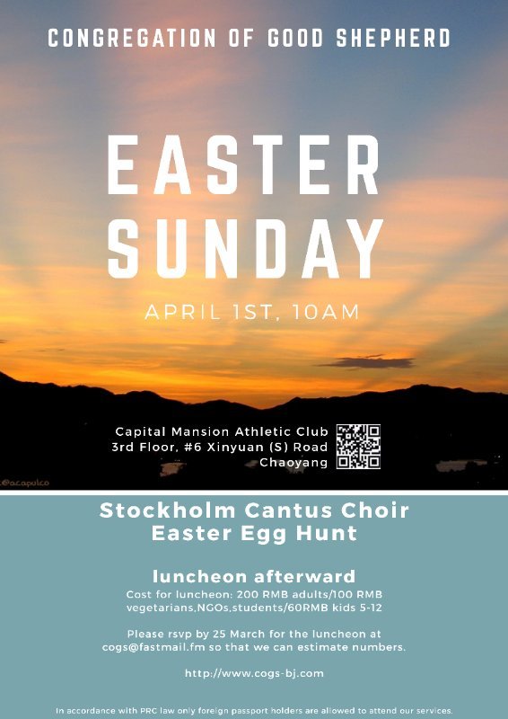 Situated at the capital mansions near Liangmaqiao, the Congregation of the Good Shepherd’s service will be held on Easter Sunday and will feature a visiting choir from Stockholm. Following mass, stick around for a buffet lunch priced at RMB 200 for adults, RMB 100 for vegetarians, students, NGOs, and RMB 60 for kids over 5 (kids under 5 can enjoy it for free). RSVP to [email protected] no later than Wednesday, Mar 28.