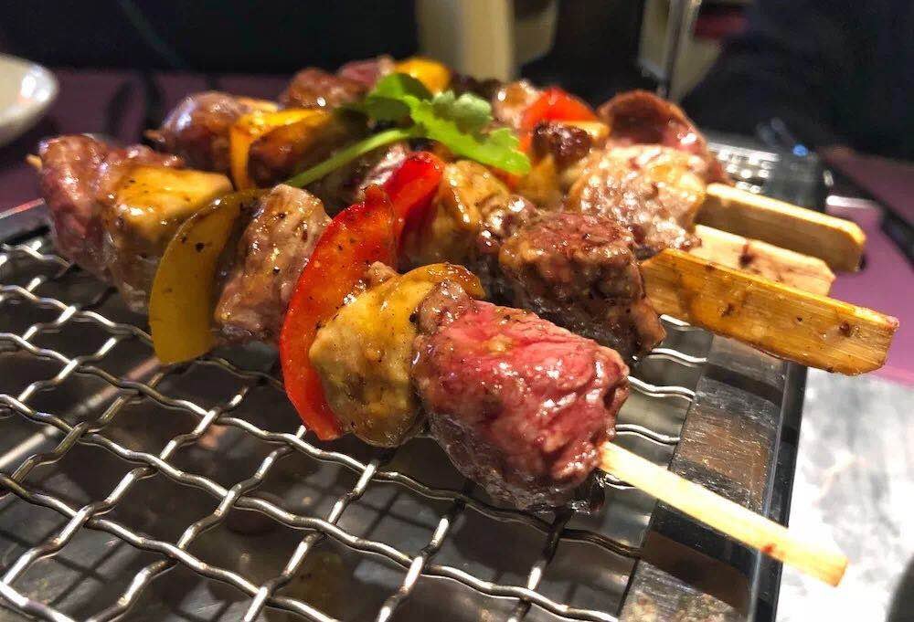 What this means in practice is a series of dishes that riff playfully off of French classics, such as beef fillet and foie gras kebabs, a take on the classic dish steak rossini, or pork meatball with miso butter escargot.