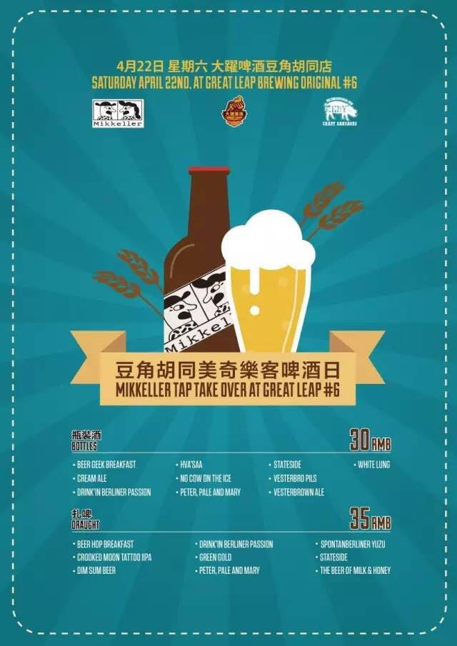 If you missed the famous Danish Mikkeller beers at Great Leap Brewing’s Beijing Invitational Craft Beer Festival in March, don’t worry, they’re holding a two-day party this weekend (Apr 22-23). On Saturday, head to Great Leap Brewing #6 (2-9pm), for nine beers on tap, RMB 35 each (including Beer Hop Breakfast, Crooked Moon Tattoo IIPA, Dim Sum Beer, Drink’in Berliner Passion, Green Gold, Peter, Pale and Mary, SpontanBerliner Yuzu, Stateside, The Beer of Milk & Honey), and 10 bottled beers, RMB 30 each (including Beer Geek Breakfast, Cream Ale, Drink’in Berliner Passion, Hva’Saa, No Cow on the Ice, Peter, Pale and Mary, Stateside, Vesterbro Pils, Vesterbrown Ale, and White Lung). Andy or Andy’s Craft Sausages will also be cooking up some mean BLTs in the yard. Cheers’ Fenghuanghui store joins in the fun with four draft beers and all of the bottled selections from 2-7pm.